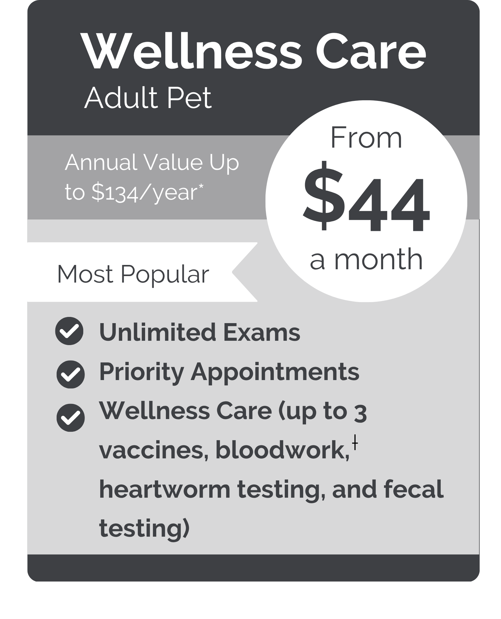 Whether it’s priority appointments and unlimited wellness exams, or you want the full vaccinations and core diagnostics, you’re covered—allowing you to budget for your pet’s care with ease.